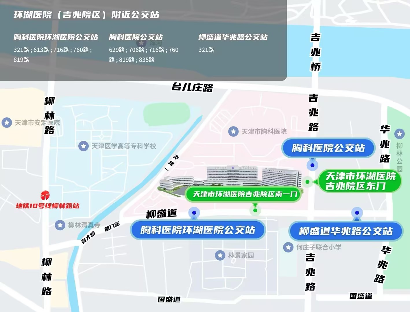 注:外地来津患者可乘坐高铁在天津(东)站、天津西站、天津南站、天津北站下车,或乘坐飞机在天津滨海国际机场下机并换乘地铁前往天津市环湖医院吉兆院区。