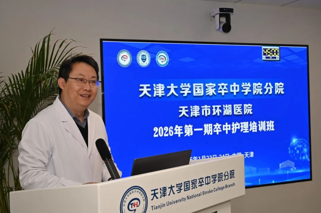 为贯彻落实“健康中国2030”战略,积极助力“百万减残工程”工作,进一步提升卒中护理专业化水平,天津大学国家卒中学院分院于2026年1月23日-24日成功举办2026年第一期卒中护理培训班。本次培训班旨在推动卒中护理规范化、系统化发展,来自天津市及周边地区多家医疗机构的护理骨干参加培训,共同学习、交流、提升。天津市环湖医院副院长岳伟出席培训班开幕式并致辞。